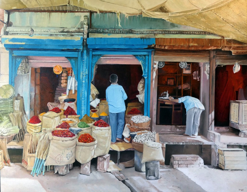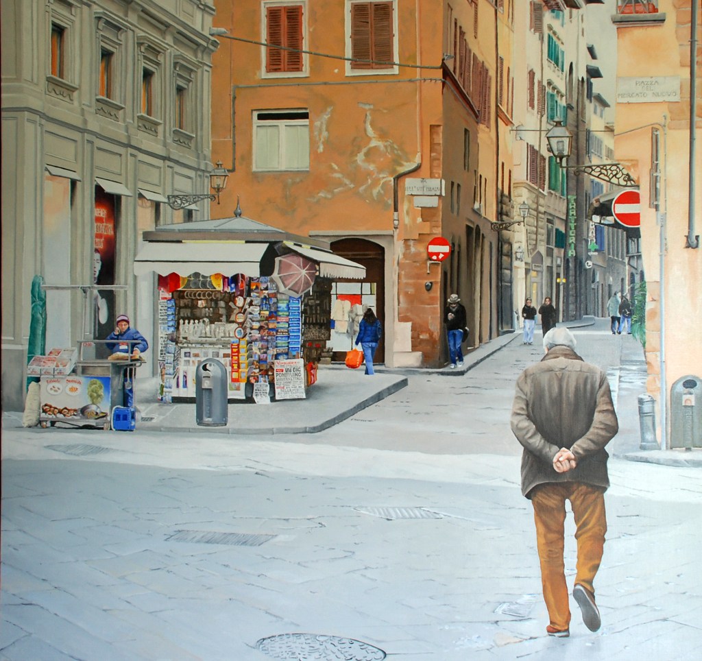 This painting is of the Piazza del Mercato, where nearby in the surrounding streets is the San Lorenzo Market. This was a cold winters day and I liked the old buildings with shuttered windows and the man holding his hands behind his back walking towards them. I exhibited this painting in a cafe in Berwick and the owner told me that she had a customer who came and instantly recognised the main figure as her father. She knew where the exact place was and her father would walk through there every day. She also recognised the clothing he was wearing.
