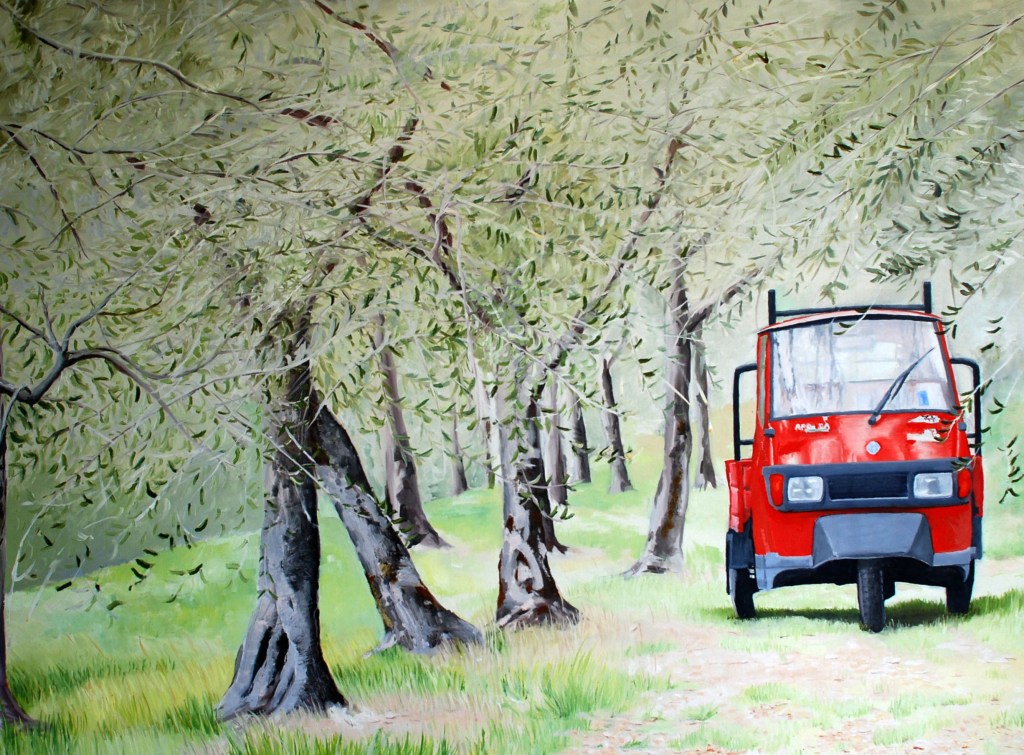 This painting is of an olive grove along an ancient Roman path on the outskirts of Spello, Italy. The three wheeled Piaggio ‘Ape’ is an Italian icon and often seen in the countryside transporting goods along small back roads and lanes.