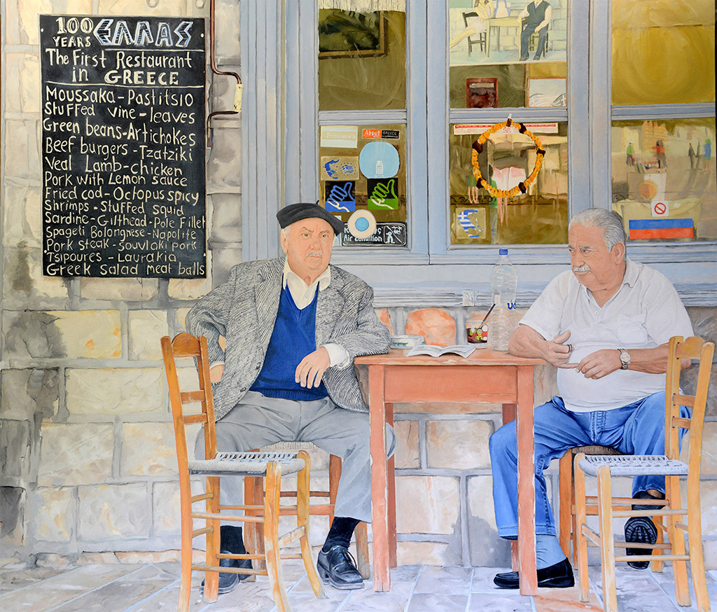 On a visit to Rome six years ago, I came across a small shop, Antica Bottega dei Sapori in Campo Fiori, that sold a fantastic range of cheeses, wines, salumi, olives and bread. I took a photograph of the entrance to the shop at night, it was just before Christmas and this man was admiring some decorations he had just put up. A number of years later I decided to paint this scene, I loved the warm colours of the walls, the yellow Vespa parked out the front and the legs of ham hanging off the rail above the entrance. I returned to this shop last year and the same Vespa was parked in the same spot. I showed the man pictured above a photograph of the completed painting which he liked and he requested that next time could I please paint his face.